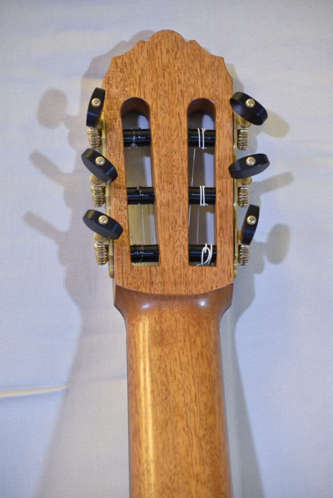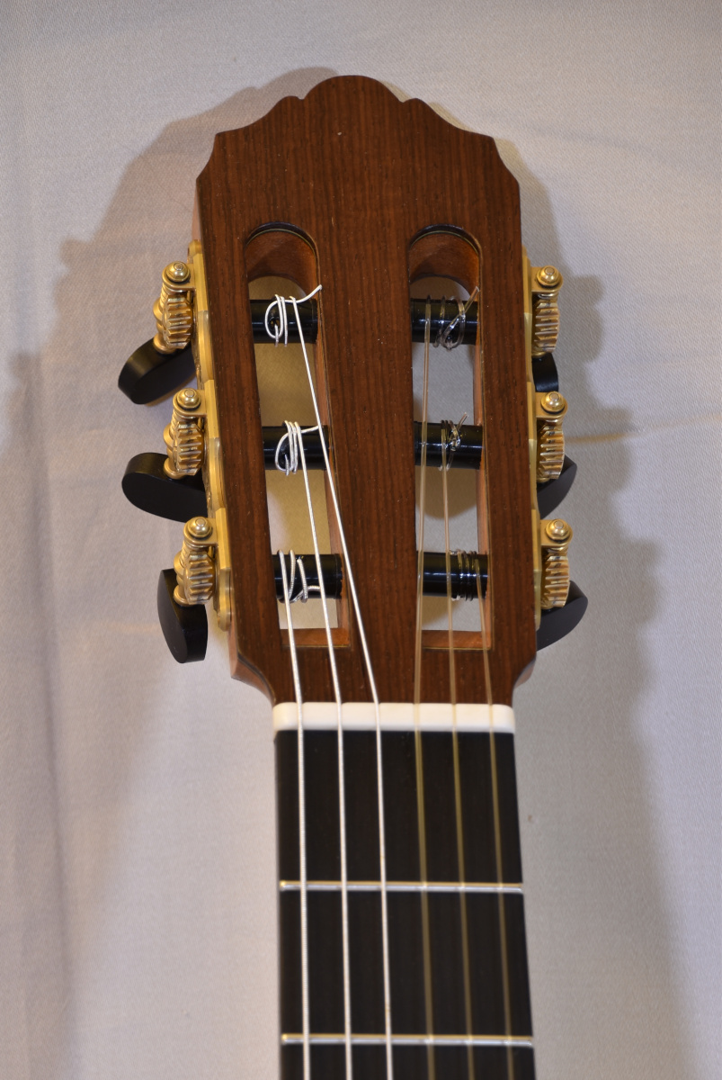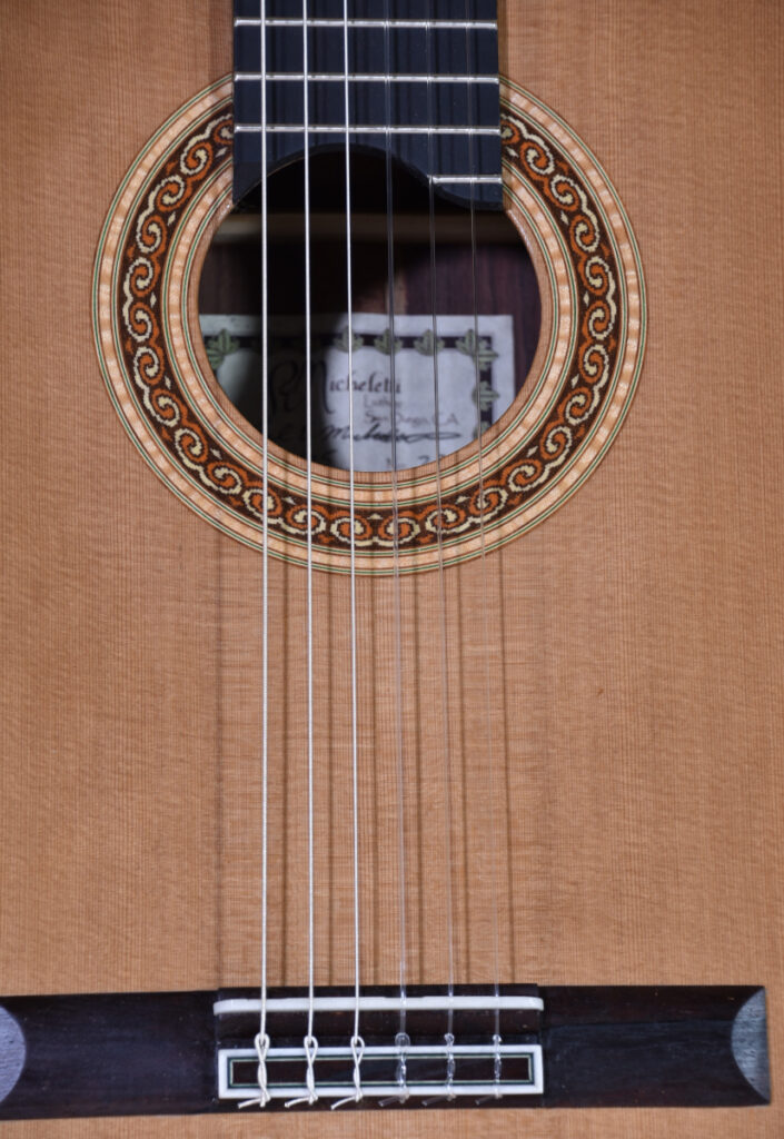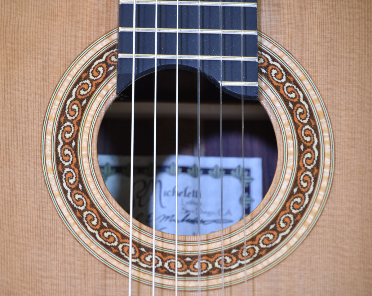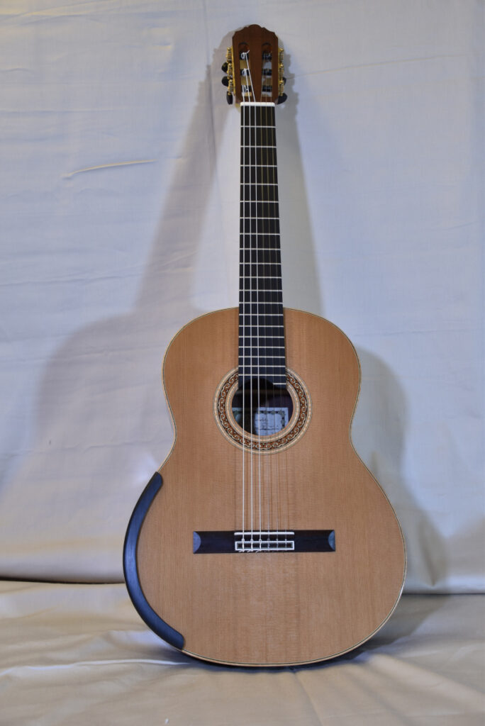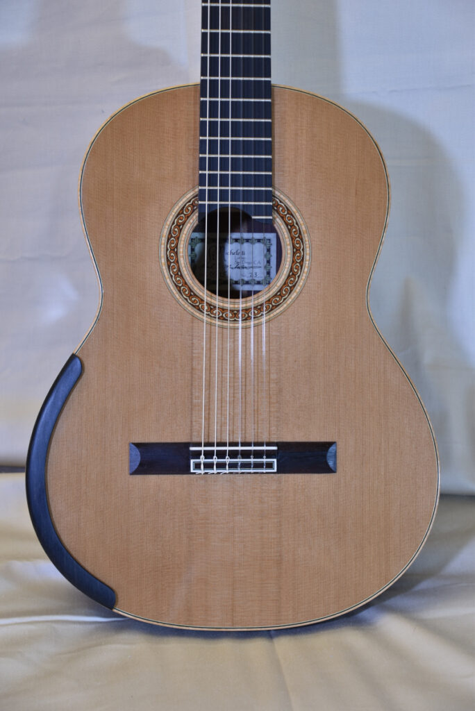 The top is an even grained super stiff Western Red Cedar. The medulary rays through the top show that this is a perfectly quartersawn top. It has a very light weight Hauser 7-fan with closure bars. The sound is punchy and bright, with a good quantity of overtones to make the sound intriguing.