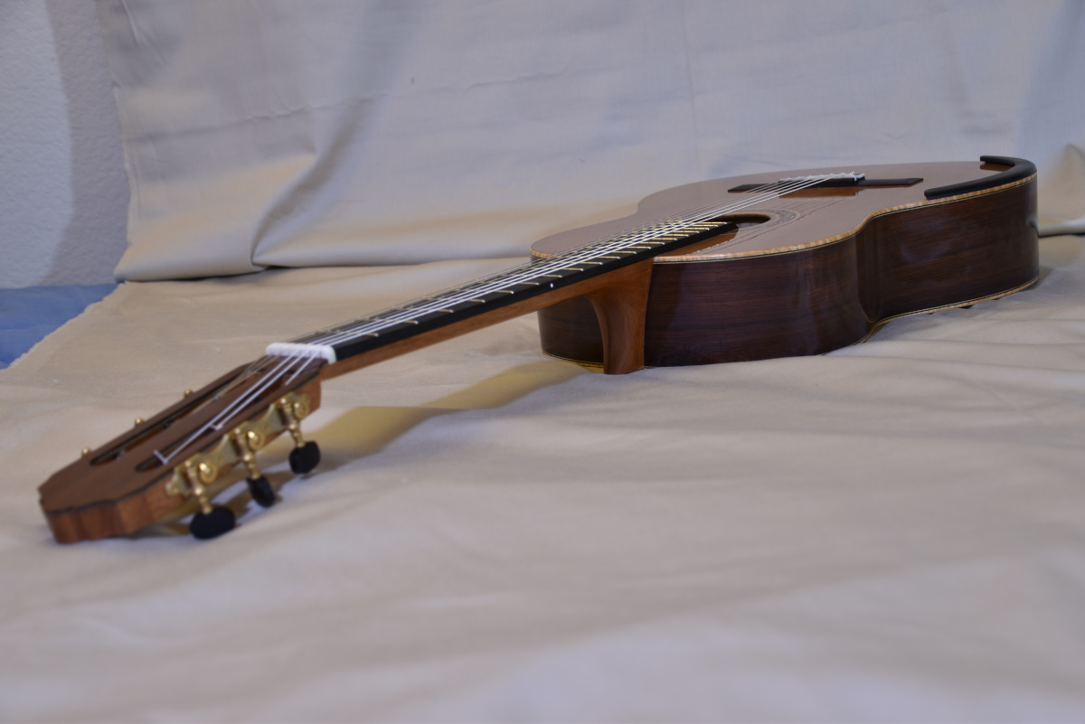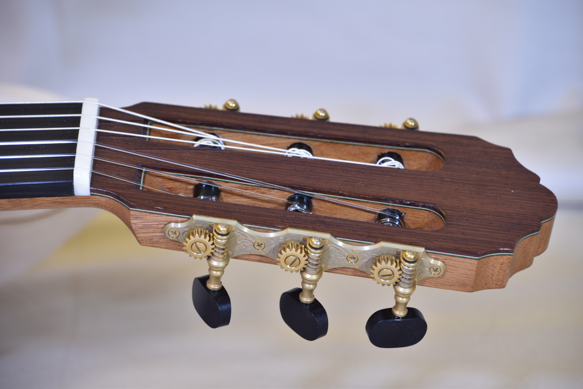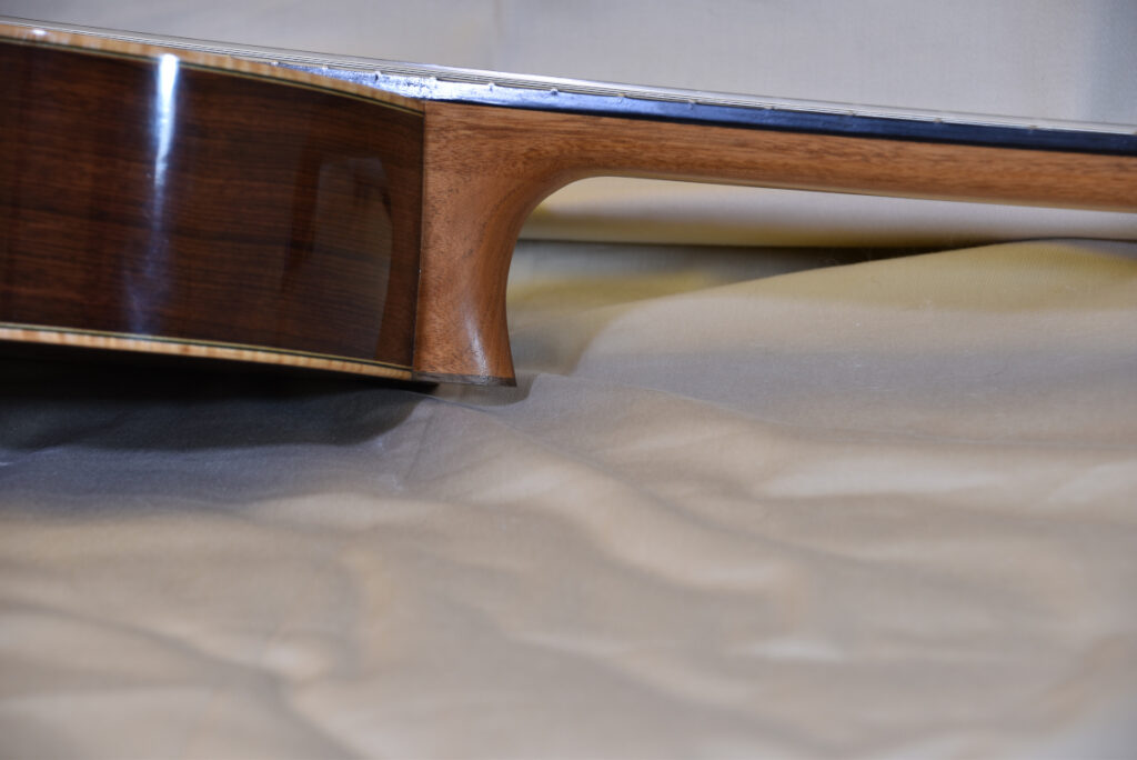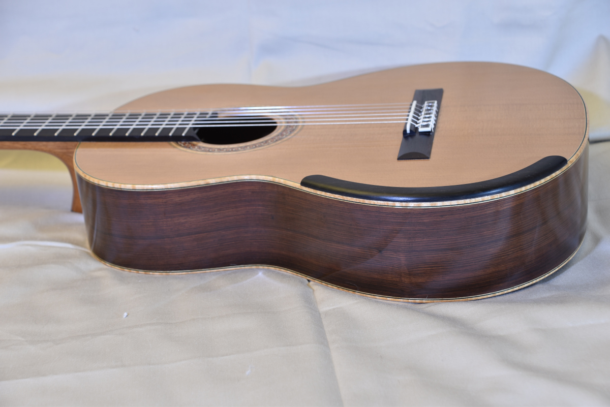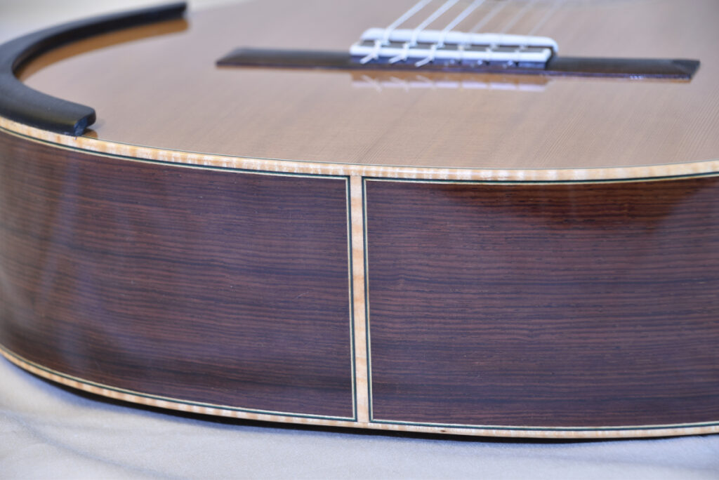 • Indian Ebony arm rest. Low profile provides a softer pressure on your right forearm. The arm rest is only glued to the bindings, so it floats over the top to prevent any impact on the sound of the guitar.