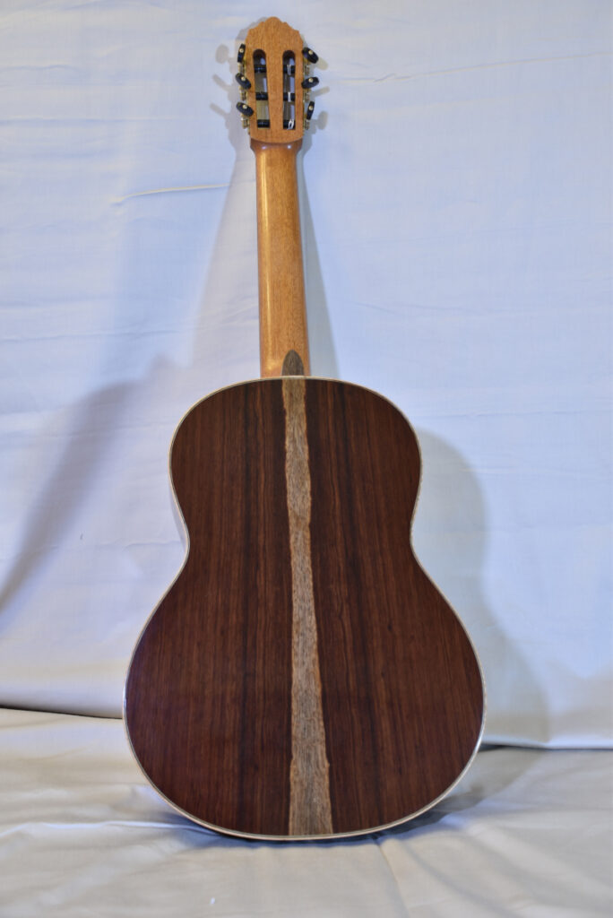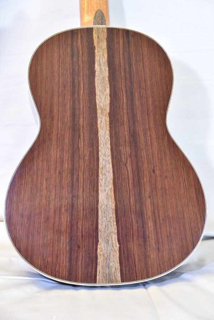 • Amazon Rosewood back and sides. This is a rare Rosewood not to be confused with Brazillian Rosewood which is a different species that is also from Amazonia. To me, Amazon Rosewood is preferable since it is denser and has the beautiful purple color tones. The sapwood (live part of the tree under the bark) was preserved and used as a center stripe to enhance the beauty.
