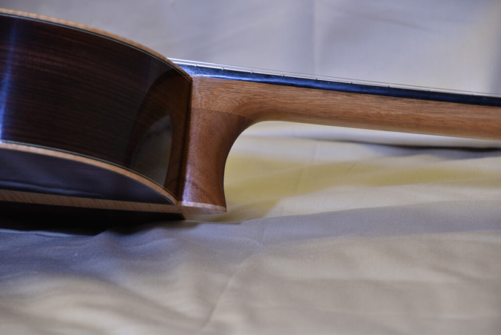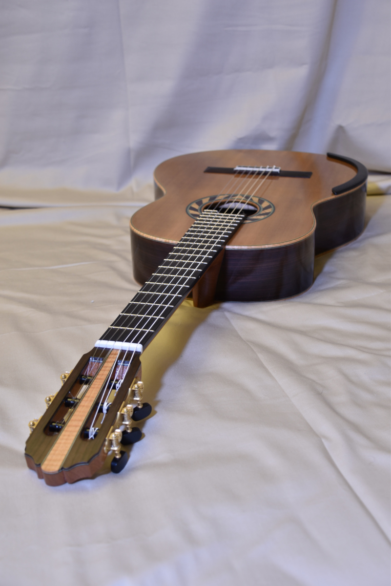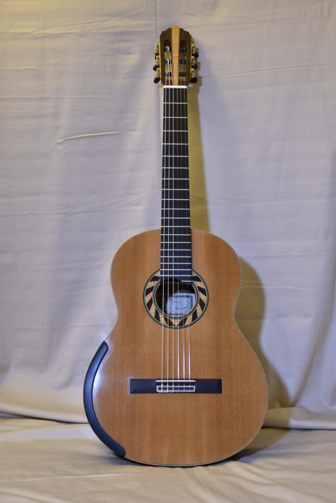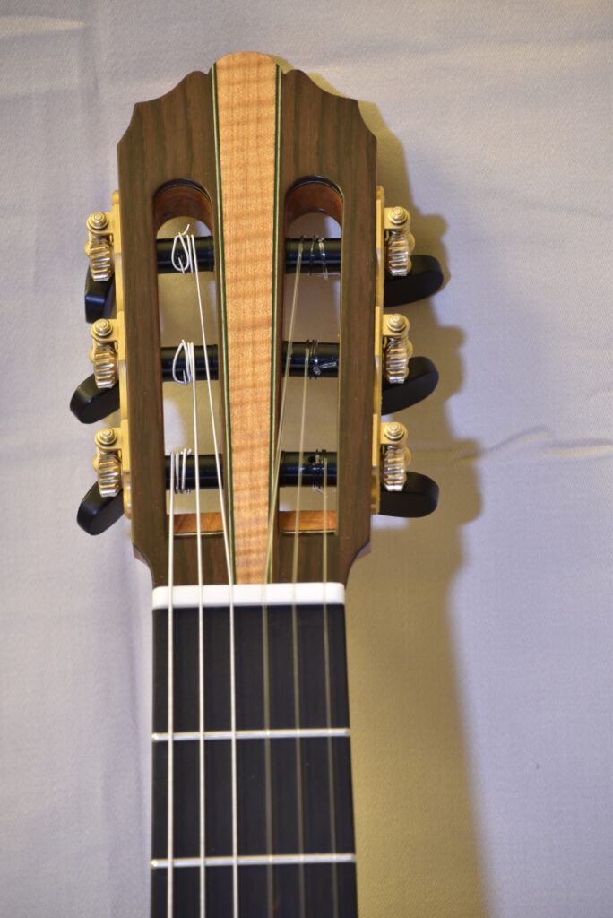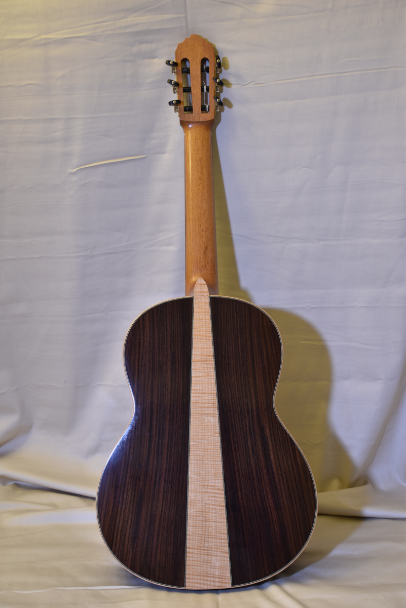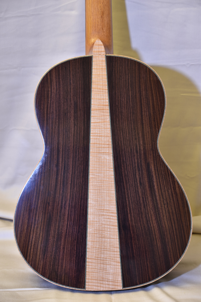 My Guitar #21 was designed by necessity. The Amazon Rosewood back for that instrument was not wide enough for a 2-piece back, so I inserted a curly maple panel in the middle and worked it into the rest of the design of the instrument. This guitar is a matching pair to that guitar, but using Western Red Cedar for the top wood and East Indian Rosewood for the main Rosewood panels.