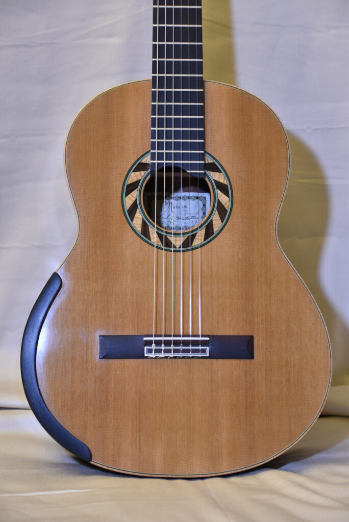 The top is an even grained super stiff Western Red Cedar. The medulary rays through the top show that this is a perfectly quartersawn top. It has a very light weight Hauser 7-fan with closure bars. The sound is punchy and bright, with a good quantity of overtones to make the sound intriguing.