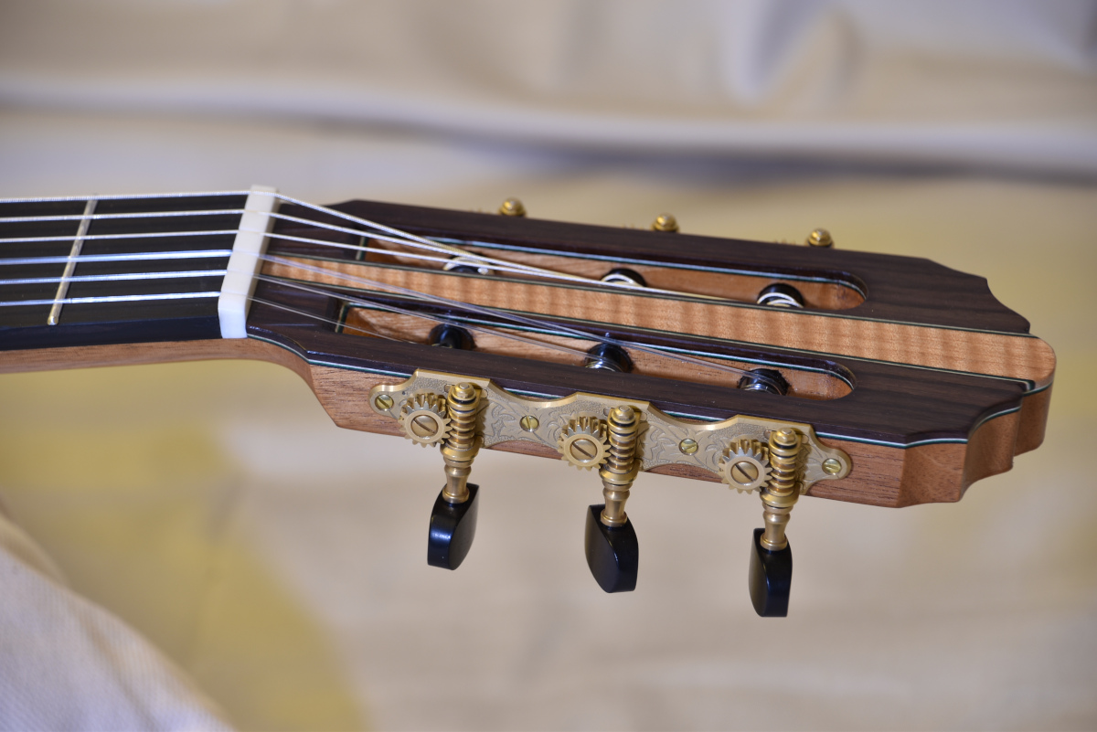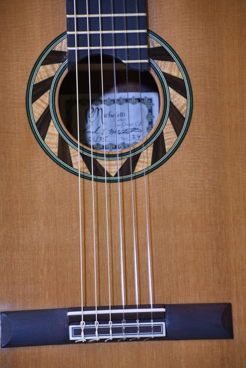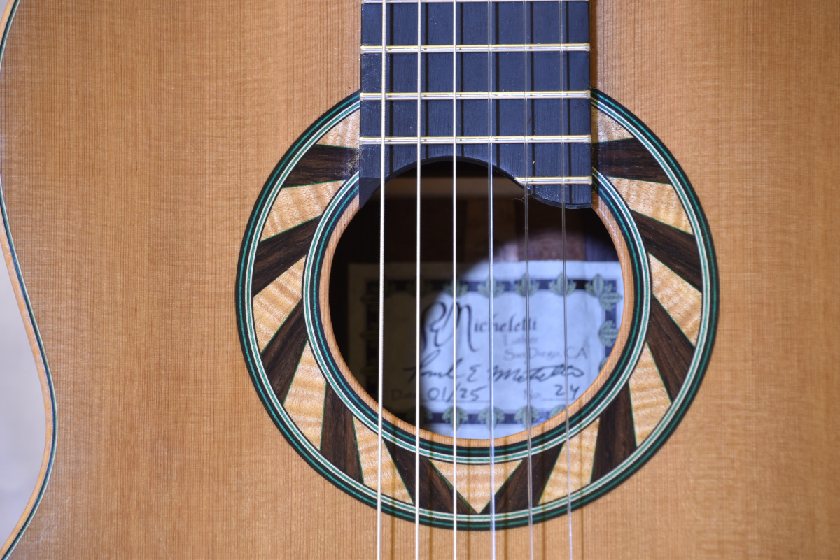 • Rosette is my own design using the same woods as used in the back of the guitar.