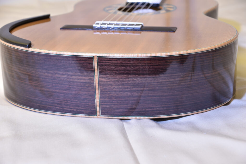 • Indian Ebony arm rest. Low profile provides a softer pressure on your right forearm. The arm rest is only glued to the bindings, so it floats over the top to prevent any impact on the sound of the guitar.